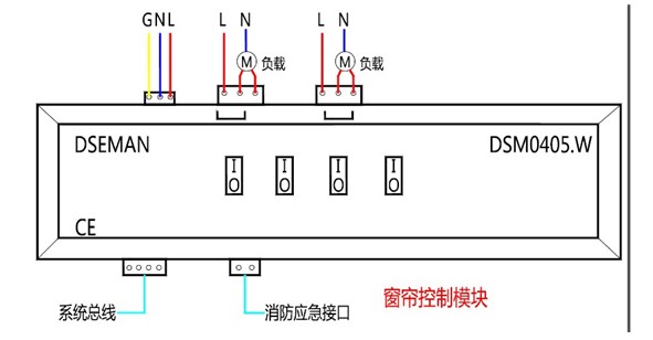 输出: 4回路5A继电器开关输出,可控制2个独立窗帘。软硬件正反转互锁。可控制窗帘停在任何位置。可设置正反转延时关闭时间。